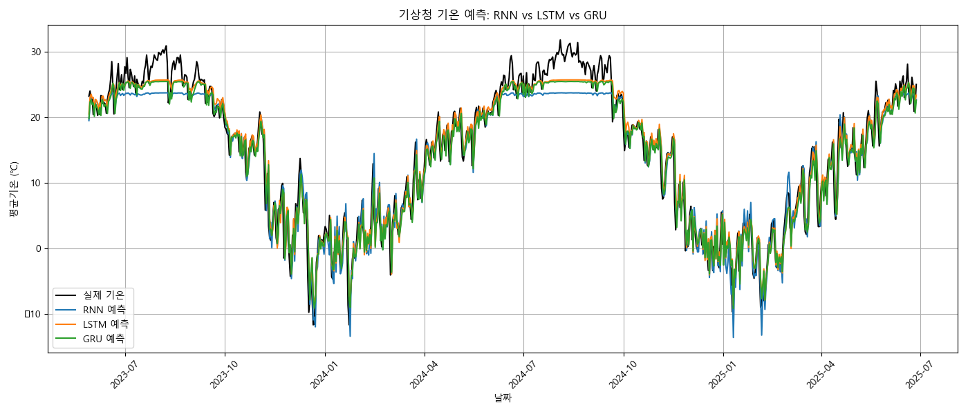 y_pred = scaler.inverse_transform(y_pred_scaled.reshape(-1,1)).flatten() # 실제 기온 단위로 역정규화