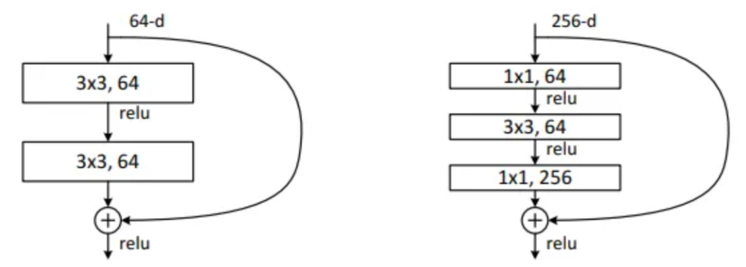 ResNet은 Residual Learning을 실제로 구현하기 위해 두 가지 residual block 구조를 사용한다.