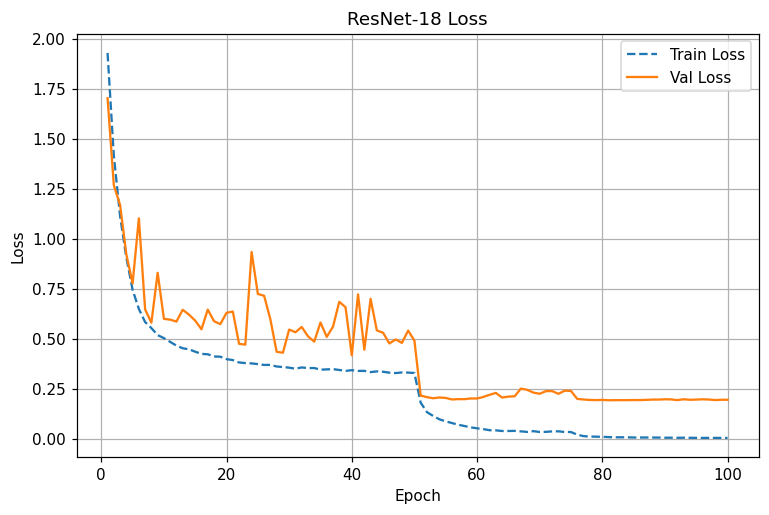 - LR step @50: 두 모델 모두 성능 점프. ResNet은 0.20대 val loss, 93%+로 치고 올라감.