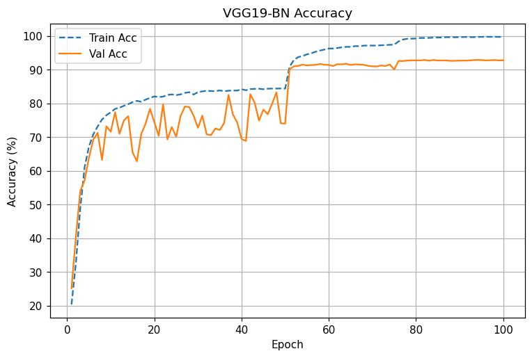VGG19-BN: 동일 스케줄에서도 변동성 높음, 후반 개선 둔화. 최종 92.7~92.9% 근처 수렴