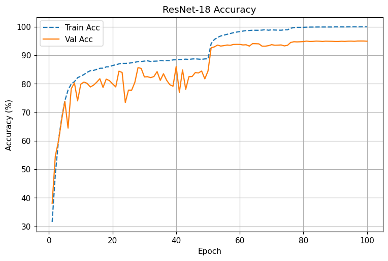 ResNet-18 : LR 스텝(50,75)에 맞춰 loss 급락 및 acc 급상승. 80에폭 이후 94.7~95.0%에 안정 수렴