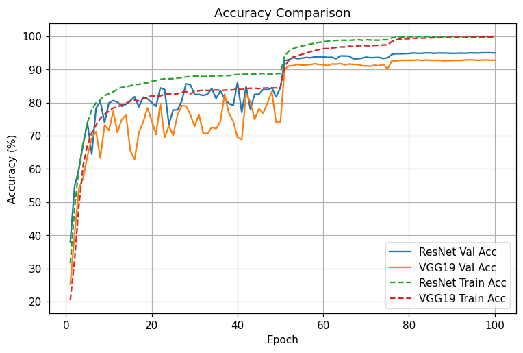 - 후기(80~100에폭): ResNet은 95% 근처에서 plateau, VGG는 92~93%에서 정체.