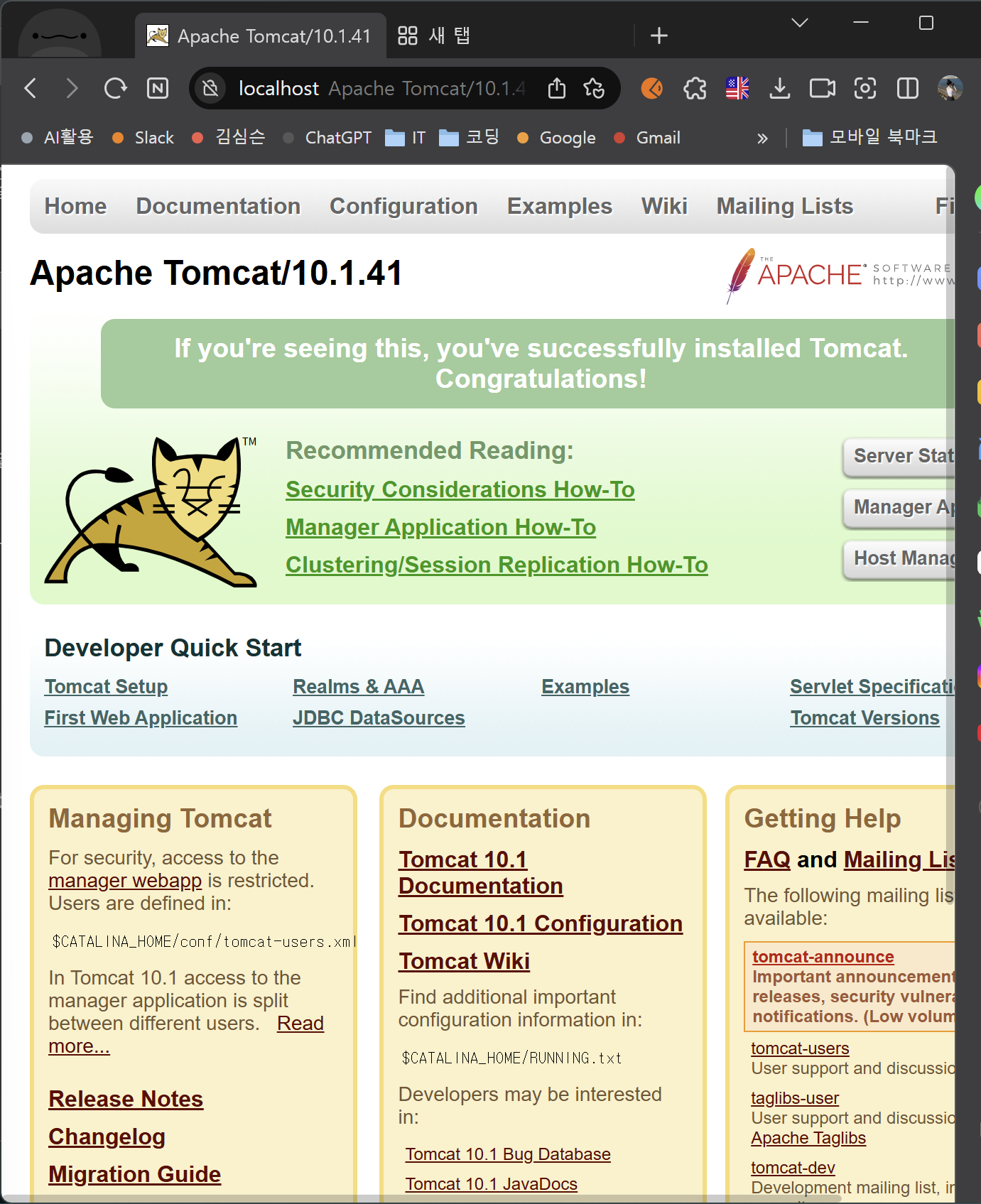 주소창에 : http://localhost:8080/ 입력하고 아래의 페이지가 나오면 잘 된 것