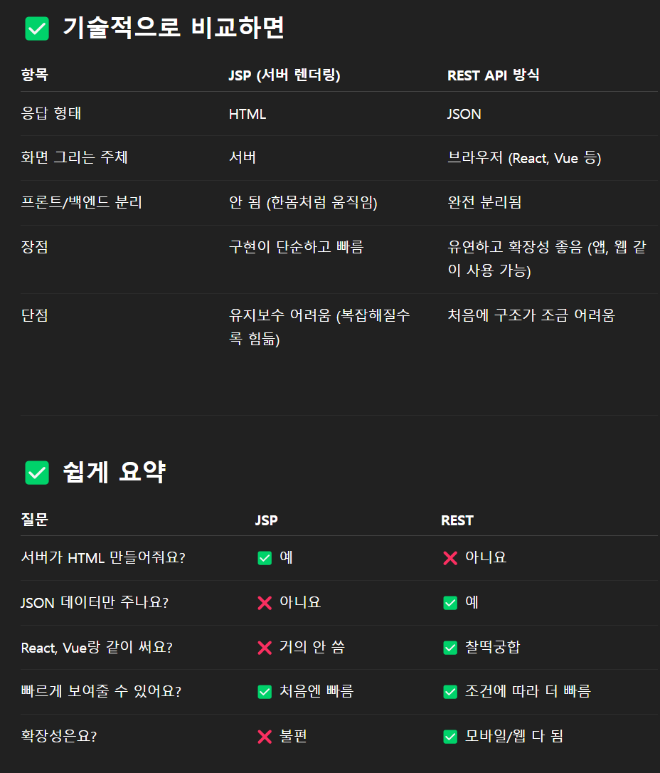 +) 실무에서 JSP보다 REST가 더 많이 쓰이는 이유 (요즘은 프론트는 React, 백엔드는 REST API가 기본 조합)